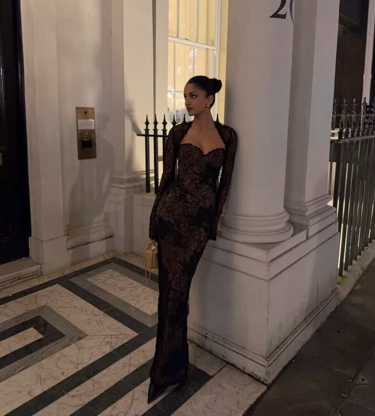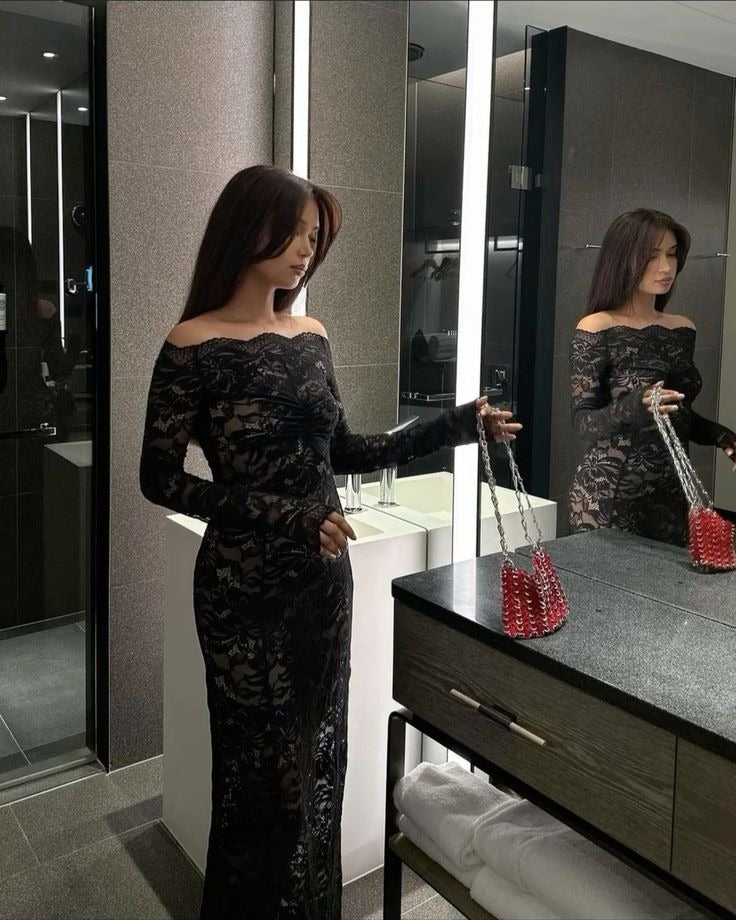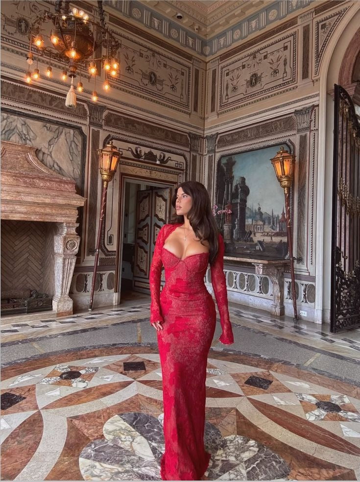 Cette silhouette spectaculaire se compose de deux pièces parfaitement pensées. Le body entièrement en dentelle épouse le corps avec précision et est doublé d’une maille sculptante gainante pour un maintien optimal, tandis que les manches restent délicatement transparentes pour créer un contraste subtil et raffiné.